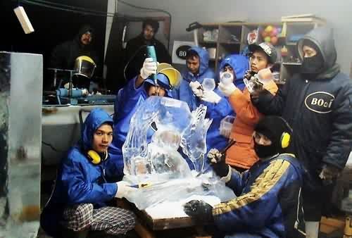ice sculptures, ice luges, ice bars are carved in cold storage, minus 8 degrees Celcius, a